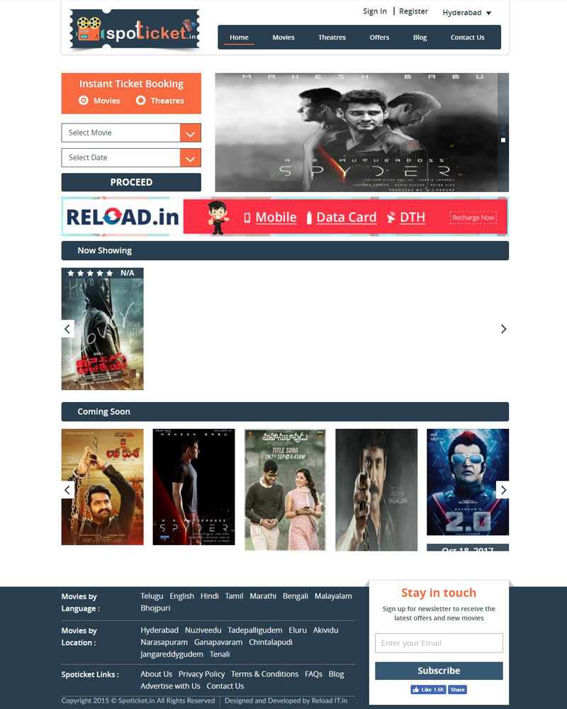 Spoticket is a web portal for online movie ticket booking. We provide service to the customer to book movie tickets in simplest and easiest way. We will provide Spot rewards/ Discount coupons to our regular customers by using those coupons you can save your money while booking movie tickets. Spoticket has tied up with leading theaters in both Telangana and Andhra Pradesh to provide best service to customers.