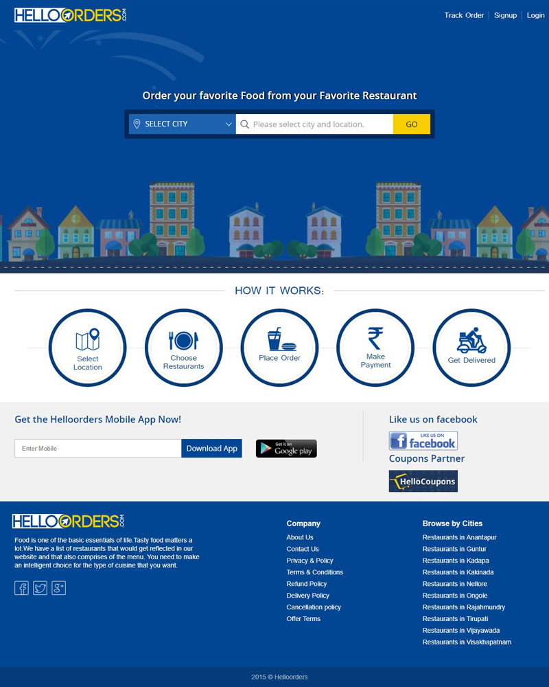 Food is one of the basic essentials of life.Tasty food matters a lot. The busy days give no room to cook and we end up either starving or eating junk. Because of lack of time and energy, we tend to skip the meal . Compromising a meal a day is not a good idea and hence we came up with a thought to serve you healthy and delicious food at your doorstep.. Wait a minute !!! did we say we deliver food at your doorstep? Yes, Helloorders is knocking your doors to take your order. Go ahead and order the food of your choice in your favourite restaurant and get to eat it at your home by may be watching a good movie or get on a busy work or just like that when ever you hate to cook.